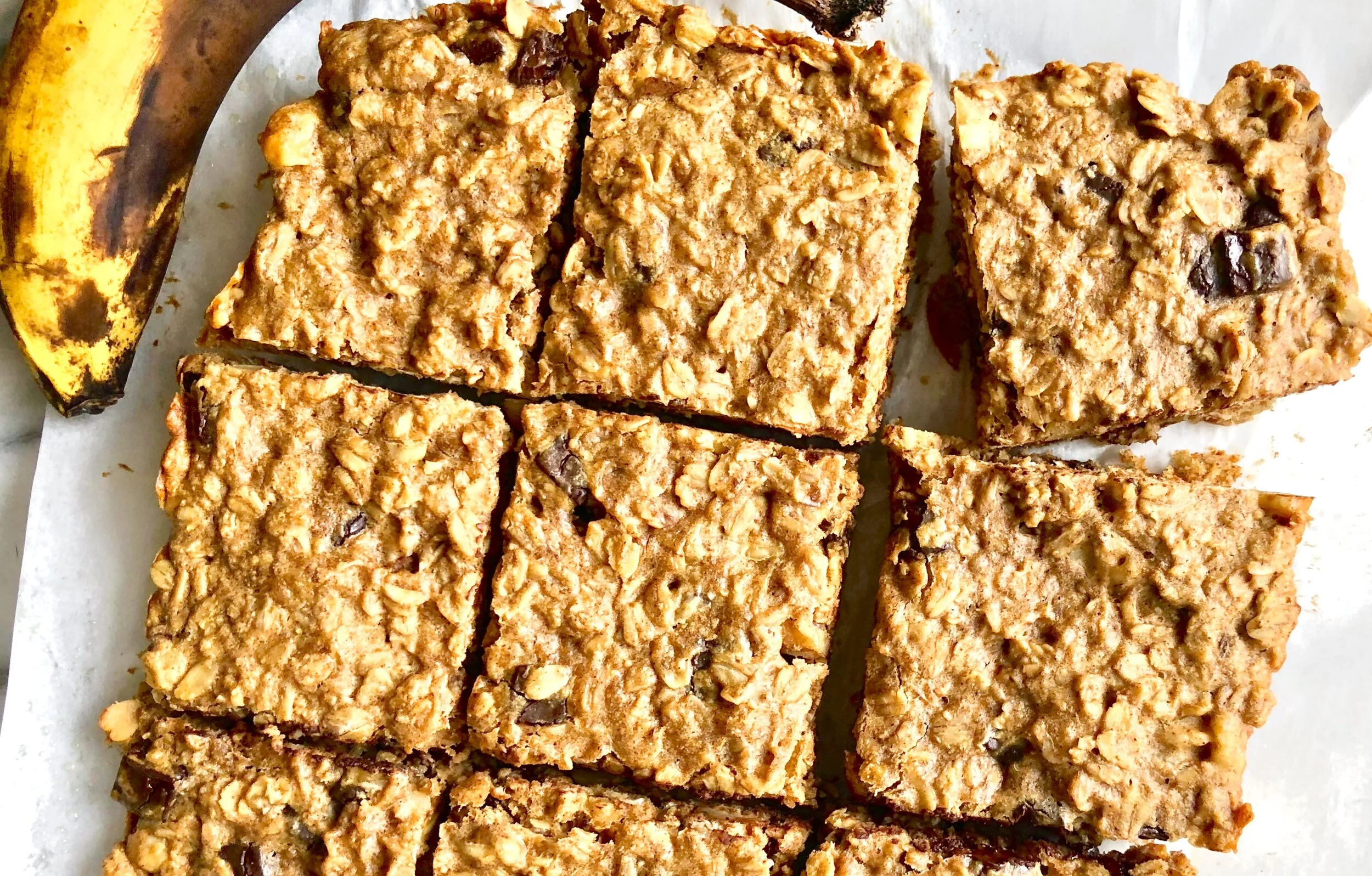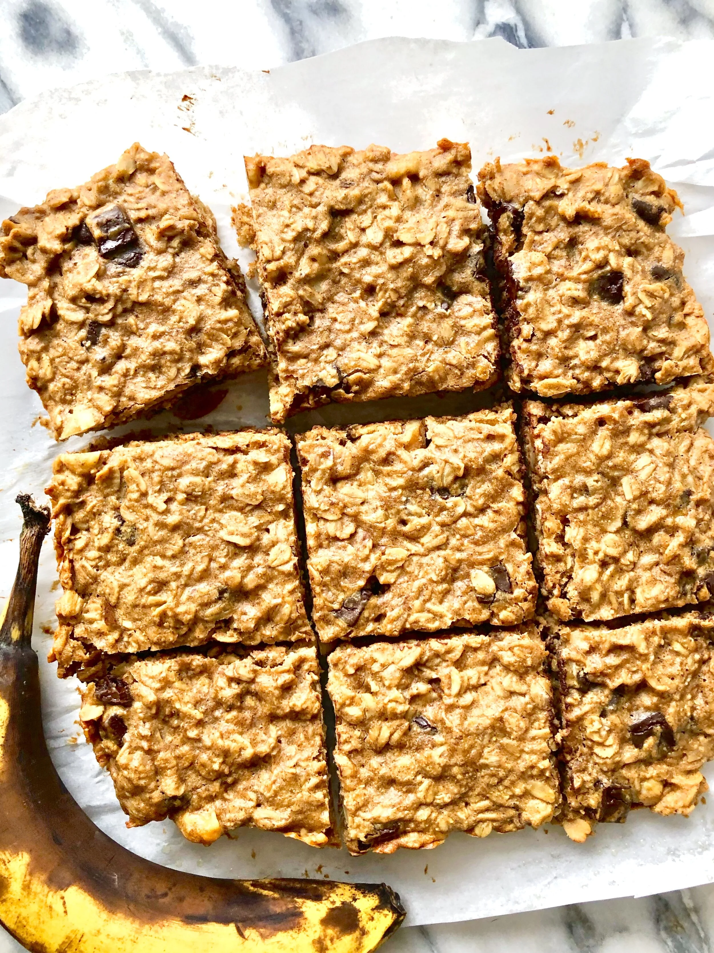 These banana bread oatmeal bars are a delicious way to accomplish all those snack goals. Built on nutrient and energy rich bananas, oats, and nuts, these bars are such an awesome way to snack away hunger. They also are a bit indulgent with a sprinkle of dark chocolate chips too. These bars are chewy with a little crunch from walnuts, and all around so satisfying. I highly suggest baking up a batch of these and enjoying them throughout the week to power you (and friends and family!) between meals, use them to fuel summer adventures, or even have as a light breakfast. Hope you enjoy!