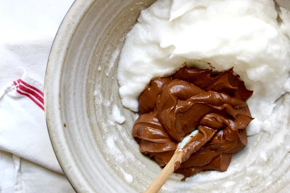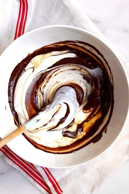 Gently fold the chocolate mixture into the eggs whites until totally combined. The more delicately you mix, the more you will preserve the air bubbles of the whipped eggs whites, leading to a fluffier mousse.